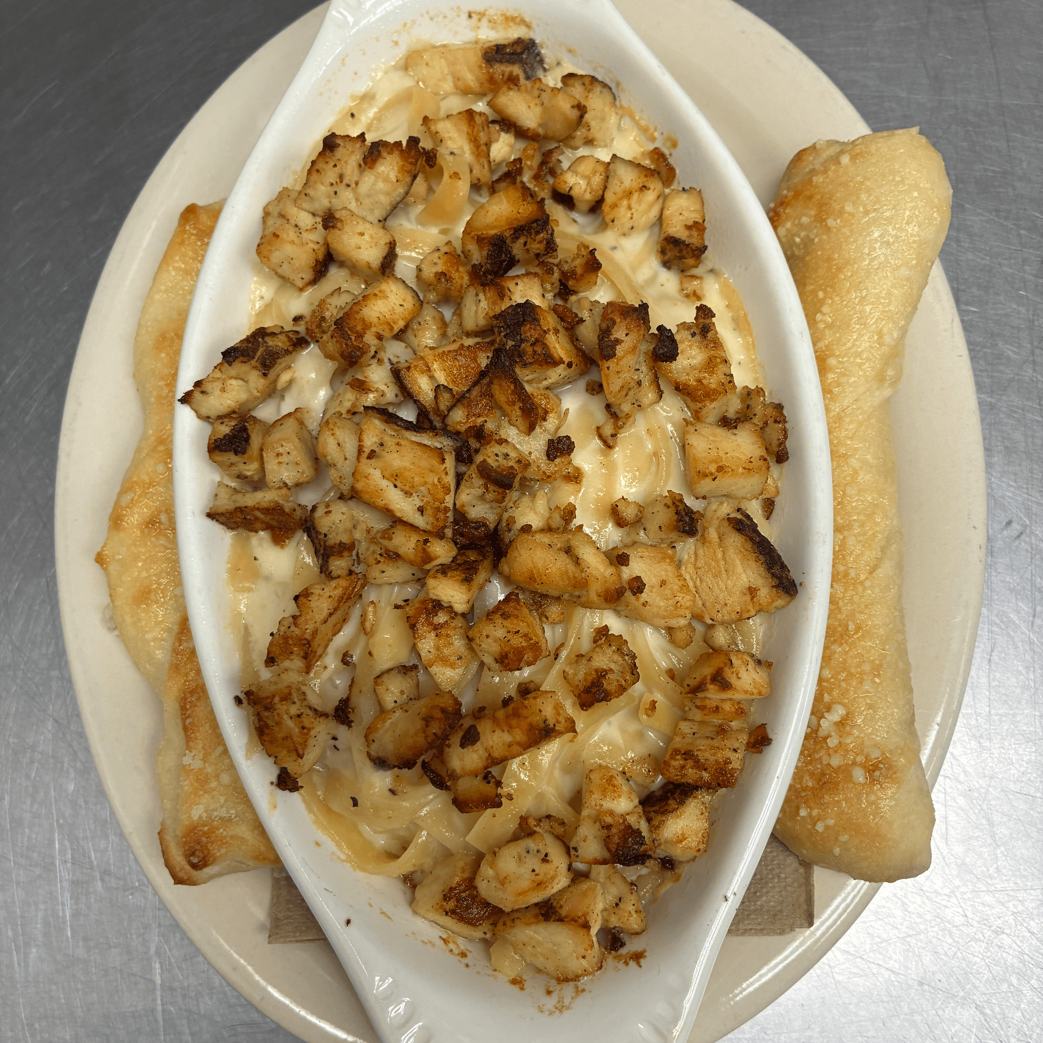 Fettuccine, grilled chicken, blackened spice, Dan's alfredo sauce. Served with 2 bread stix.