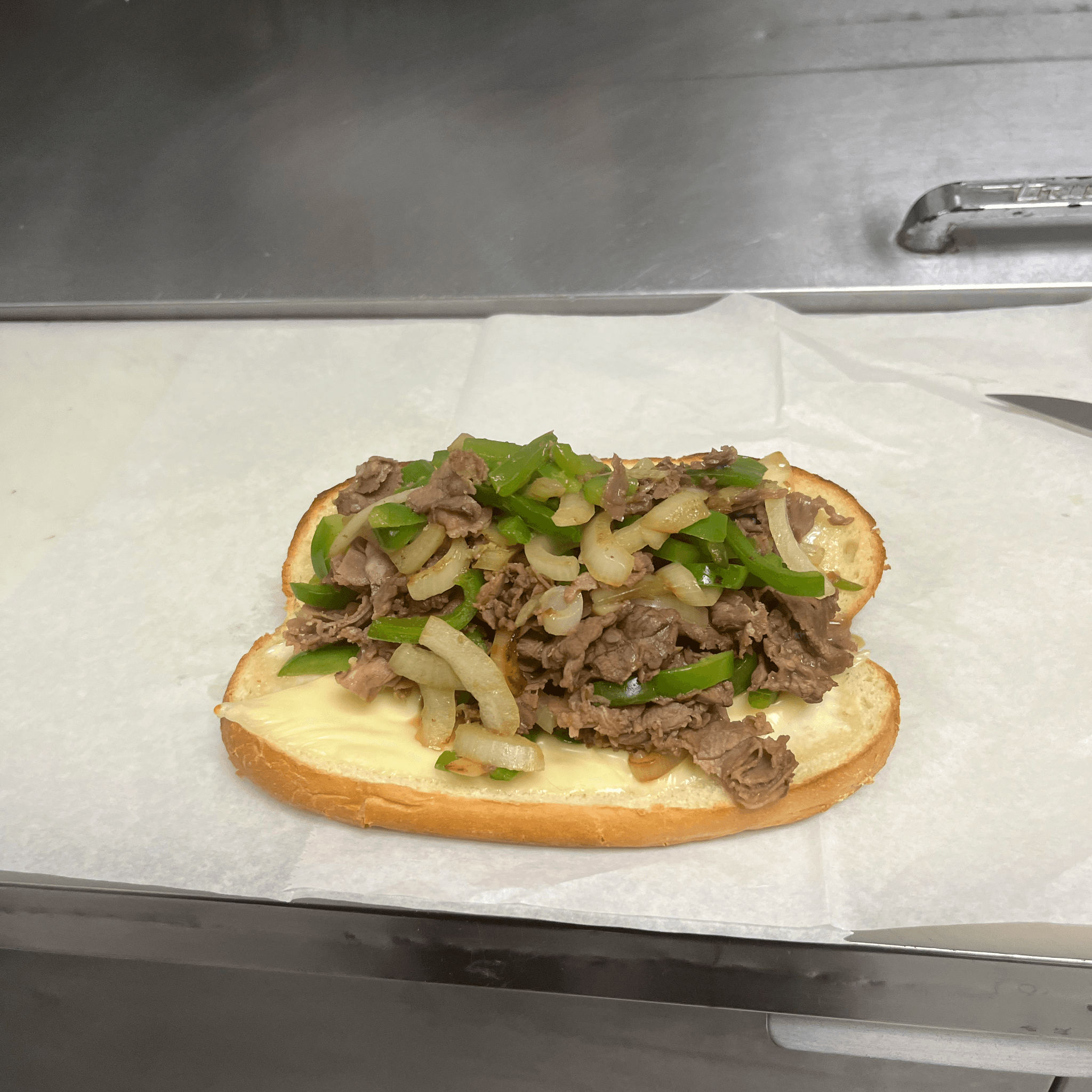 Roast beef, onions, green peppers, cheese, mayo. Comes on a toasted 8" roll, lettuce and tomato are available if wanted.