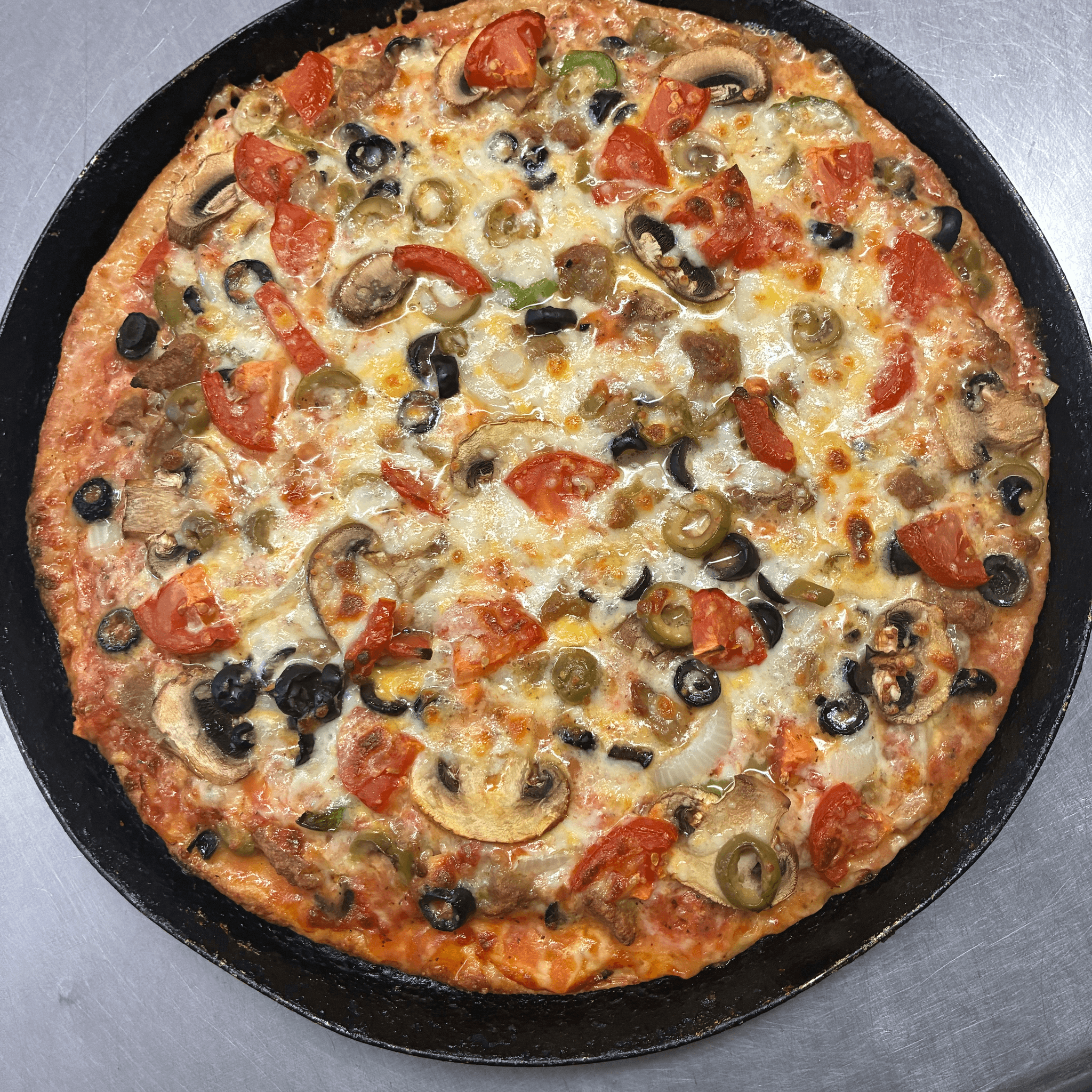 Pepperoni, sausage, onion, green peppers, mushrooms, ham, black & green olives.